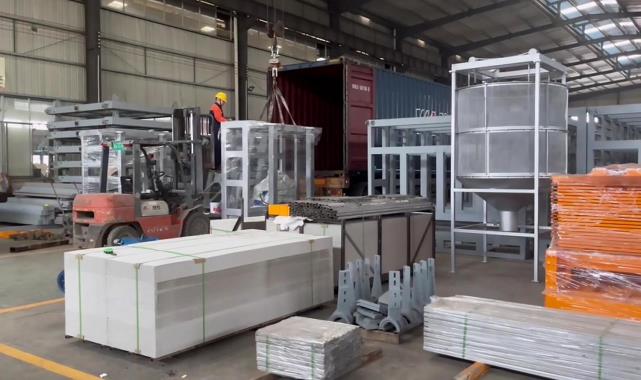 , the production workshop of Guangxi Hongfa Heavy Industry was busy. The workers were rushing for orders in full swing. A container was parked in the delivery area, and the complete set of wallboard line equipment of Indonesian customers had been neatly arranged around. ready to go.